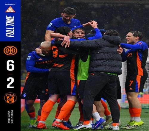 北京时间1月24日,在意甲第22轮的比赛中,国际米兰在开场23分钟就0-2落后的情况下,最终连进6球完成逆转,主场6-2战胜升班马比赛,暂时以6分优势领跑积分榜。