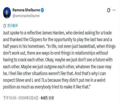 当然,交易达成后,关于“哈登这次到底是不是主动提出交易申请”成了一个争议话题,ESPN资深记者罗蒙娜·谢尔本(Romona Shelburne)在社交媒体上发表了一段哈登的表述,称哈登表示并没有主动向快船提出“交易申请”,“我不愿成为阻碍快船未来发展的绊脚石,希望他们能真正获得重建机会并积累选秀资本。而在克利夫兰,我看到了东部争冠的契机,尽管我渴望留在洛杉矶再战,毕竟从未夺冠过,但作为篮球运动员,我认为这里(克利夫兰)更有机会。”